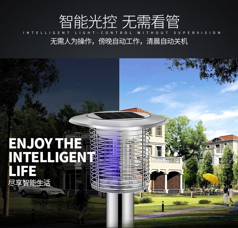 2、智能光控,白天自動(dòng)充電,晚上開啟滅蚊,無需看管。