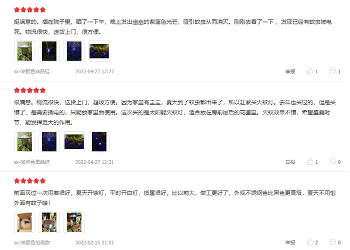 二、裝了戶外滅蚊燈之后體感如何前面我們說了,很多人認(rèn)為戶外滅蚊燈是智商稅,疑慮就在于這里。事實上,根據(jù)我們多年的經(jīng)驗和用戶反饋,只要是在滅蚊燈“殺傷力”范圍內(nèi),蚊子困擾是可以明顯緩解的。至于這個“殺傷半徑”,你可以在產(chǎn)品的介紹上查看,也可以說明自身情況,讓商家給推薦,這樣才會實現(xiàn)更好的滅蚊效果。你擔(dān)心蚊子“取之不盡用之不竭”,其實滅蚊燈也不那么差勁,它可以持續(xù)、自動消滅蚊子,只要路過的,就有機(jī)會被永遠(yuǎn)地留下來。